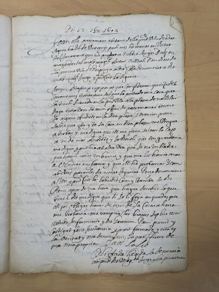 Joan Oller passementier habitant de la présente ville, agè suivant ce qu'il a dit de plus ou moins vingt ans, en vertu du jurement qu'il a fait à nostre seigneur Dieu, au pouvoir du trés magnifique Anton Trillach des droits de la présente ville de Perpignan a dénoncé au très magnifique juge et à la présente cour la chose suivante :