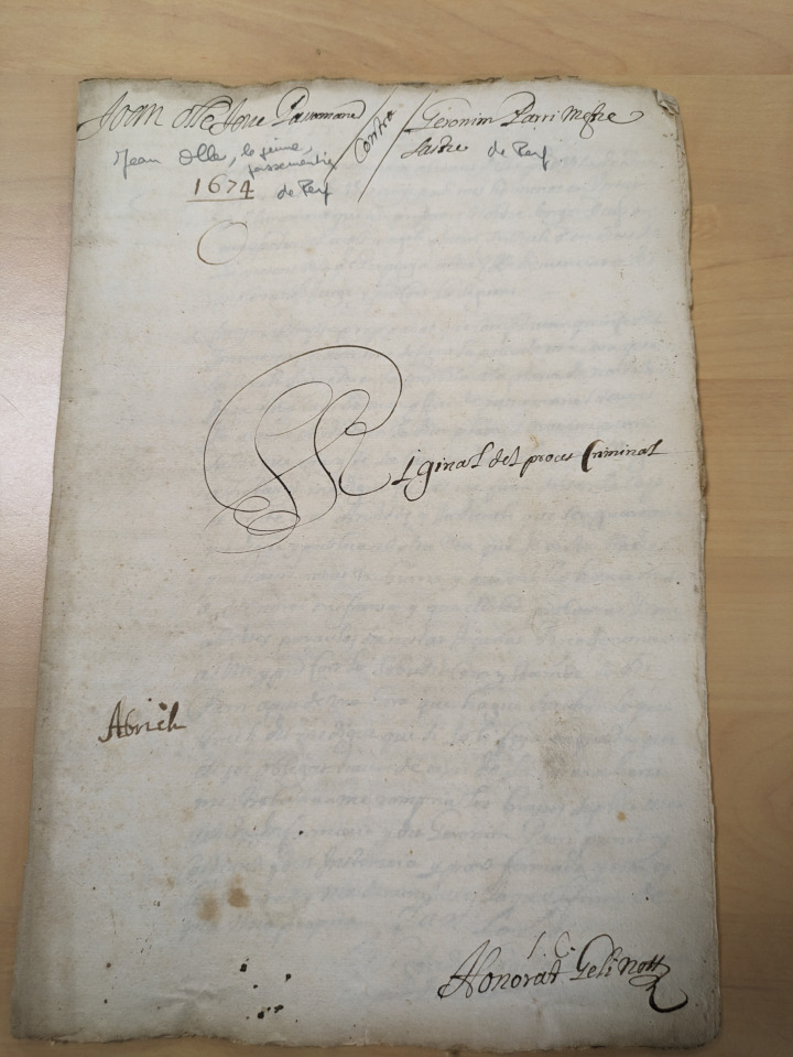Joan Oller passementier habitant de la présente ville, agè suivant ce qu'il a dit de plus ou moins vingt ans, en vertu du jurement qu'il a fait à nostre seigneur Dieu, au pouvoir du trés magnifique Anton Trillach des droits de la présente ville de Perpignan a dénoncé au très magnifique juge et à la présente cour la chose suivante :